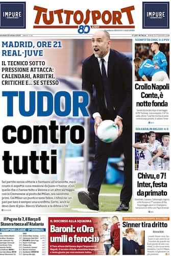 - In apertura la Juve e l'appuntamento di questa sera con il Real Madrid: "Tudor contro tutti". Il tecnico "sotto pressione attacca: calendari, arbitri, critiche e... se stesso". Spazio anche alla sconfitta del Napoli 6-2 contro il PSV, Conte: "Notte fonda". In prima pagina poi la vittoria dell'Inter 0-4 contro la Royale Union Saint-Gilloise: "Festa da primato". Infine il tennis, con Sinner che "tira dritto" dopo il no alla Davis.