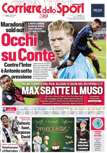 - Occhi su Conte: contro l'Inter, l'allenatore del Napoli è sotto pressione dato che arriva da due ko di fila. Hojlund non recupera, Neres provato come falso 9. Pronto Juan Jesus con Buongiorno. L'allenatore neroazzurro Chivu, invece, insegue l'ottava vittoria: "Rivalità e stesse ambizioni, ci giochiamo tanto". Milan fermato a San Siro dal Pisa (2-2). Gilardino sfiora il colpo a San Siro dopo il gol del vantaggio di Leao: nella ripresa segnano Cuadrado su rigore e Nzola, poi arriva il pari di Akhetame al 93'
