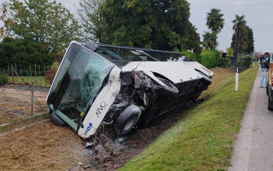 La corsa della società Atvo, destinata prevalentemente agli studenti, è quella che parte da San Donà di Piave (Venezia) alle 6.30, passa per i comuni di Torre di Mosto e San Stino di Livenza, nel veneziano, per raggiungere il comune di Oderzo, nella zona delle scuole. L'impatto è avvenuto subito dopo una grande curva. L'automobile avrebbe invaso la corsia opposta, forse a causa di un malore che avrebbe fatto perdere lucidità all'anziano: l'autista Atvo a quel punto ha tentato di evitare l'impatto, che però è stato inevitabile e di due mezzi hanno terminato la corsa fuori strada, nei due lati opposti. Il bus è finito di fianco nel fossato di destra: il conducente, dopo essersi accertato delle condizioni degli studenti, ha aperto la botola del "tetto" del bus, permettendo ai ragazzi di uscire. Niente da fare invece per l'automobilista. Sulla dinamica dell'incidente, sono in corso accertamenti da parte dei Carabinieri. I due mezzi sono stati posti sotto sequestro.