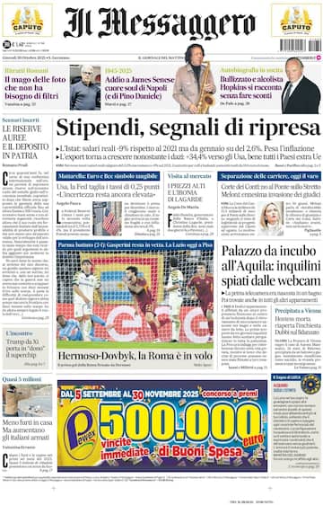 - "Stipendi, segnali di ripresa". I dati Istat: "Salari reali -9% rispetto al 2021 ma da gennaio su del 2,6%. Pesa l'inflazione". Corte dei Conti: "No al Ponte sullo Stretto", per Meloni è una "ennesima invasione dei giudici". Usa: "La Fed taglia i tassi di 0,25 punti". Spazio poi per l'incontro Trump - Xi con il tycoon che "porta in dono il superchip". Cronaca, L'Aquila: "Palazzo da incubo, inquilini spiati dale webcam". Calcio: "Hermoso-Dovbyk, la Roma è in volo".