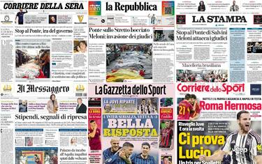In primo piano, sulle prime pagine dei quotidiani in edicola oggi, lo stop al Ponte sullo Stretto da parte della Corte dei Conti che ha scatenato l'ira del governo, tra la premier Meloni ed il ministro Salvini. A Gaza, intanto, ritorna la tregua dopo le bombe di Israele mentre in Brasile è stato eseguito un maxi-blitz contro i narcos che ha causato oltre 130 vittime nelle favelas. Infine, per il calcio, spazio ai risultati del turno infrasettimanale di Serie A