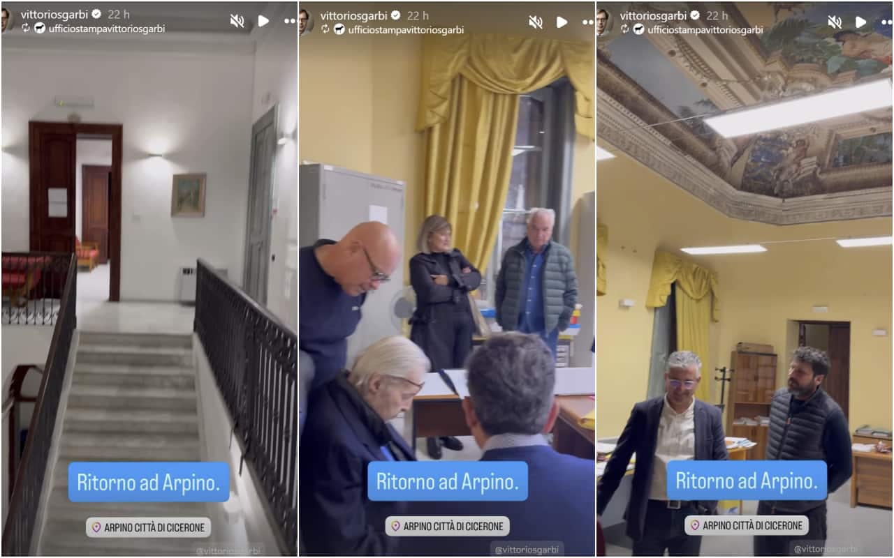 Un breve ritorno dietro la scrivania nel Municipio di Arpino per Vittorio Sgarbi. Il sindaco del comune nella provincia di Frosinone, che ormai da tempo a causa dei suoi problemi di salute non si recava in città, si è presentato quasi a sorpresa intorno alle 16:45 di ieri, 30 ottobre, dopo aver avvisato il vicesindaco Massimo Sera. Sgarbi è stato accolto dal suo secondo e da altri membri dell'amministrazione comunale che compaiono insieme al critico d’arte in una serie di immagini che sono state condivise sui social dal profilo Instagram dell’ufficio stampa di Sgarbi e poi rilanciate dal suo account personale.