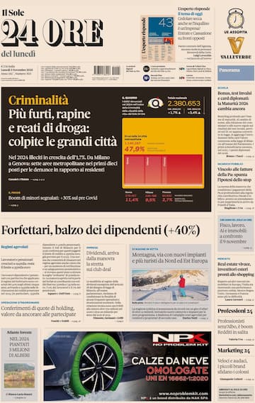 - I dati del Viminale sull'aumento della criminalità in Italia in primo piano sul Sole 24 Ore: più furti, rapine e reati di droga, colpite le grandi città. Da Milano a Genova: sette aree nei primi 10 posti per le denunce in rapporto ai residenti