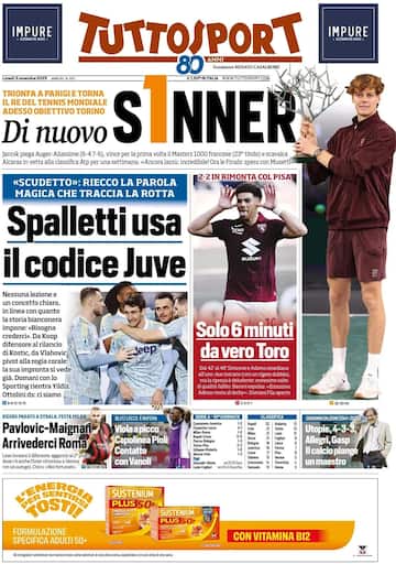 - Tuttosport omaggia Sinner con un gioco di parole per il ritorno al numero uno del ranking Atp. Si parla anche del nuovo corso juventino tracciato da Luciano Spalletti dopo il successo all'esordio con la Cremonese