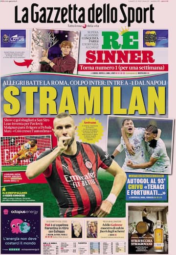 - 'Stramilan' titola La Gazzetta dello Sport celebrando il successo dei rossoneri sulla Roma che riavvicina la squadra di Allegri alla vetta. A San Siro decide una rete di Pavlovic, con Dybala che fallisce il rigore del possibile pareggio. In alto la vittoria parigina di Sinner, che permette a Jannik di tornare, almeno per una settimana, il numero uno al mondo