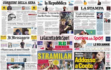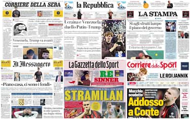 I venti di guerra in Venezuela campeggiano in apertura sulla maggior parte dei giornali in edicola oggi. Trump è pronto ad andare avanti e dice: "Per le operazioni non serve l'ok del Congresso". Duplice duello con Putin, che spinge l'offensiva a Kiev e potrebbe inviare missili a Maduro. Spazio anche al referendum sulla Giustizia, al piano del governo per gli sfratti lampo e alla cronaca, col brutale omicidio di Messina. Sugli sportivi il trionfo di Sinner a Parigi e il Milan vittorioso nel big match contro la Roma