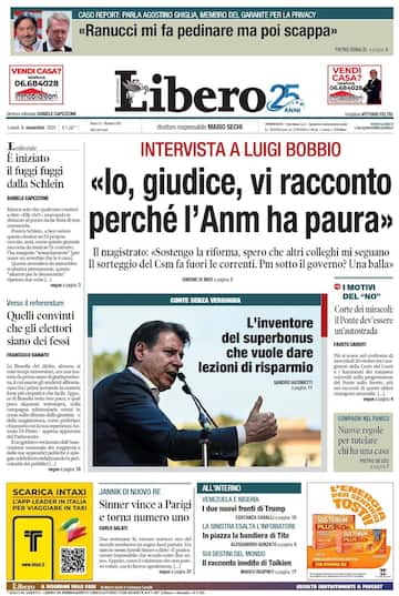 - Intervista al magistrato Luigi Bobbio in apertura su Libero: "Io, giudice, vi arcconto perché l'Anm ha paura". Sotto l'attacco al leader M5s Giuseppe Conte, definito 'l'inventore del superbonus che vuole dare lezioni di risparmio'