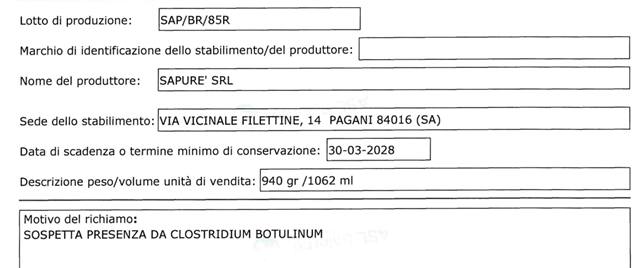 Il lotto interessato dal provvedimento di richiamo è quello con codice SAP/BR/85R e termine minimo di conservazione fissato al 30 marzo 2028. Come spiega l’avviso il ritiro dal commercio è stato disposto in via precauzione dallo stesso produttore per sospetta presenza di Clostridium Botulinum, vale a dire il batterio del botulino che produce delle neurotossine responsabili del botulismo.