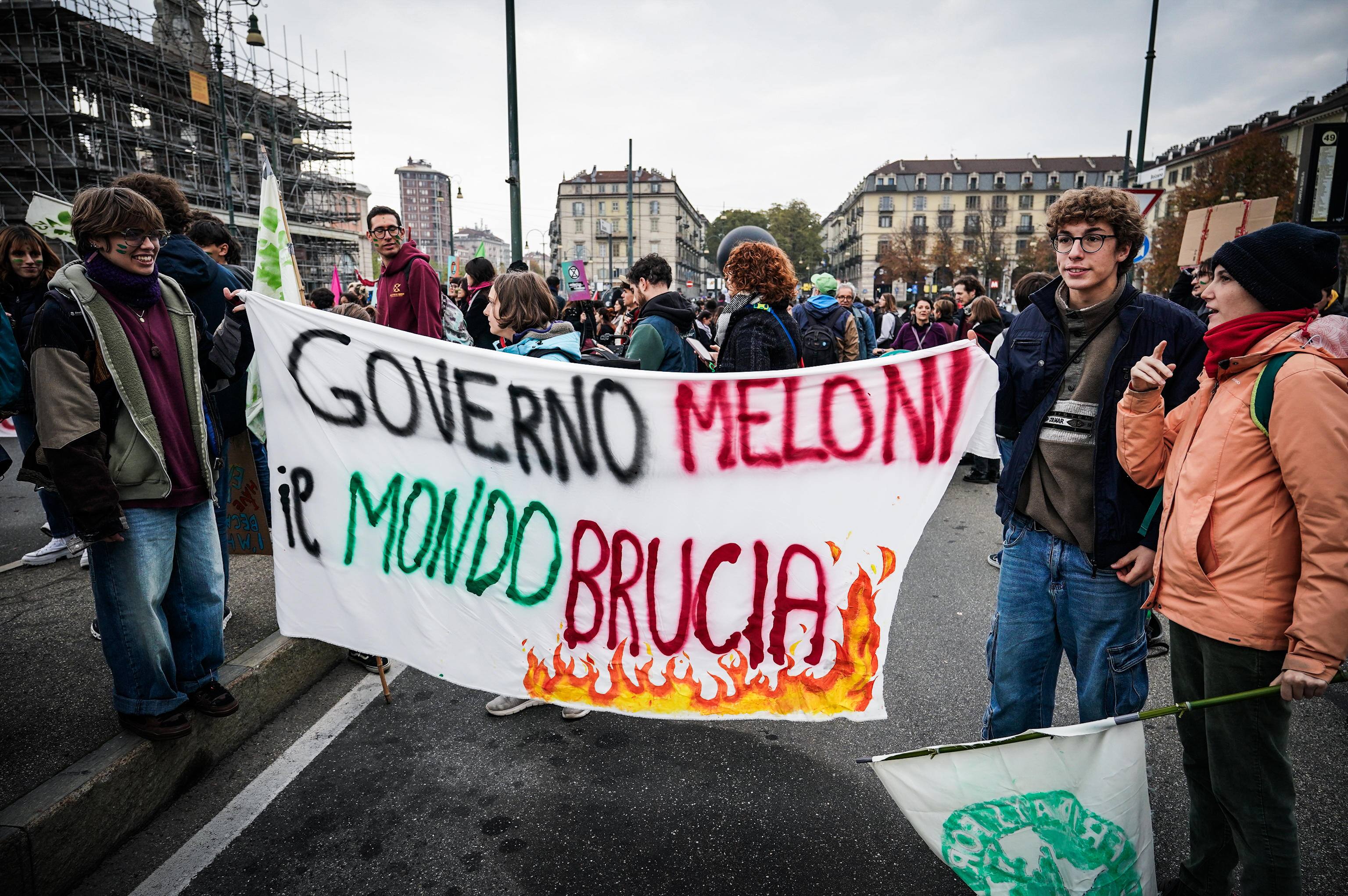 Il corteo studentesco a Torino, che ha visto sfilare circa 1.300 partecipanti, ha bruciato alcuni cartelli contro la guerra, davanti alla sede territoriale del ministero dell'Istruzione, in corso Vittorio Emanuele II. Scritte con minacce alla premier sono state fatte davanti alle Ogr. In corteo erano presenti studenti dei collettivi ambientalisti e di quelli delle scuole superiori. Divisi in due spezzoni che hanno preso percorsi differenti, da una parte i Fridays for Future e dall'altra i collettivi studenteschi.