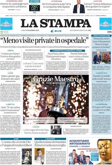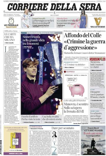 - In apertura il discorso del presidente della Repubblica a Berlino: “Affondo del Colle: ‘Crimine la guerra d’aggressione’”. In primo piano anche “Sinner trionfa nella grande sfida tra fenomeni”, con la vittoria del tennista altoatesino su Alcaraz alle Atp Finals di Torino. Tra gli altri titoli dedicati allo sport: “Fuochi d’artificio. Poi ha vinto la testa” e “Una bella rivalità che diventerà storia”. In taglio basso troviamo “Manovra, è scontro. Sullo sciopero la frenata di FdI”. In spalla, l’analisi “Le carte che ha Milano”.