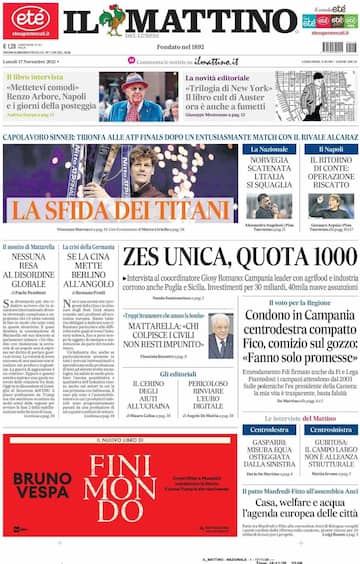 - L’apertura è sportiva con “La sfida dei titani”, sul trionfo di Sinner alle Atp Finals. In primo piano anche il monito di Mattarella “Mattarella: ‘Chi colpisce i civili non resti impunito’”, con il commento “Nessuna resa al disordine globale” e la crisi della Germania “Se la Cina mette Berlino all’angolo”. In taglio centrale, l’economia con “Zes unica, quota 1000”, un’intervista al coordinatore Giosy Romano. Tra le altre notizie, “Condono in Campania, centrodestra compatto. Fico, comizio sul gozzo: ‘Fanno solo promesse’”.