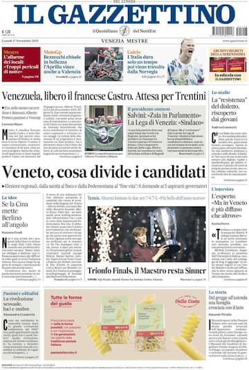 - In apertura: “Venezuela, libero il francese Castro. Attesa per Trentini”. A centro pagina “Veneto, cosa divide i candidati”, “Elezioni regionali, dalla sanità al fisco e dalla Pedemontana al "fine vita": 6 domande ai 5 aspiranti governatori”. In taglio basso, lo sport con “Trionfo Finals, il Maestro resta Sinner”. Tra le altre notizie: “Se la Cina mette Berlino all’angolo” e “La ‘resistenza’ del dialetto, riscoperto dai giovani”.