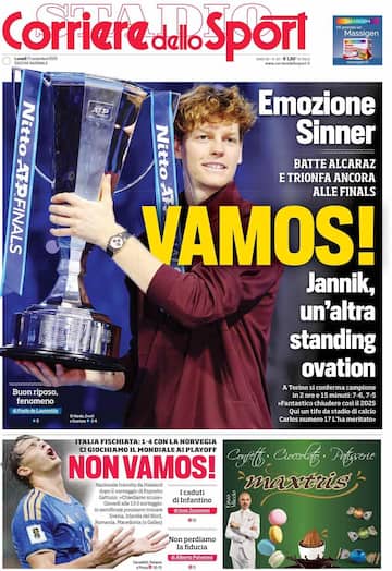 - L’apertura è interamente dedicata al tennis con “Vamos! Emozione Sinner, batte Alcaraz e trionfa ancora alle Finals”. In taglio basso, delusione per la Nazionale con “Non vamos! Italia fischiata: 1-4 con la Norvegia ci giochiamo il Mondiale ai playoff”. Spazio anche al commento “Non perdiamo la fiducia”.