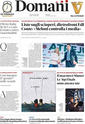 - In apertura la manovra con “Liste sugli scioperi, dietrofront FdI. Conte: ‘Meloni controlla i media’”. In spalla, l’analisi europea “Effetto Italia. Se in Ue cade il muro contro i nazionalisti” e “Così insegno il ‘gender’ nelle scuole”. Lo sport celebra Sinner con “Il maestro è Sinner. Le Atp Finals sono ancora sue”. In taglio basso: “La Terra si sta oscurando e così si scalda più velocemente”.
