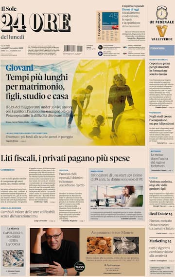 - In apertura “Giovani, tempi più lunghi per matrimonio, figli, studio e casa”, con il dato secondo cui il 63% dei maggiorenni under35 vive ancora con i genitori. Al centro pagina, il titolo “Liti fiscali, i privati pagano più spese”. In spalla, l’approfondimento “Copertura piena per gli studenti in formazione scuola-lavoro”. In basso, tra le altre notizie, “Il fondatore di una start up? Uomo di 39 anni. Le donne sono solo il 9%”.