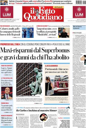 - L’apertura è su economia e politica con “Maxi-risparmi dal Superbonus e gravi danni da chi l’ha abolito”. In alto spazio alle tensioni nel governo con “Salvini e Crosetto litigano sulle armi a Kiev?”, e alle “Tangenti ucraine, ecco la soffiata ai perquisiti: ‘Mindich&C. avvisati’”. In spalla, il commento di Marco Travaglio, “Ma mi faccia il piacere”. In taglio basso, lo sport celebra Sinner con “Re Carlos s’inchina al maestro Sinner”.