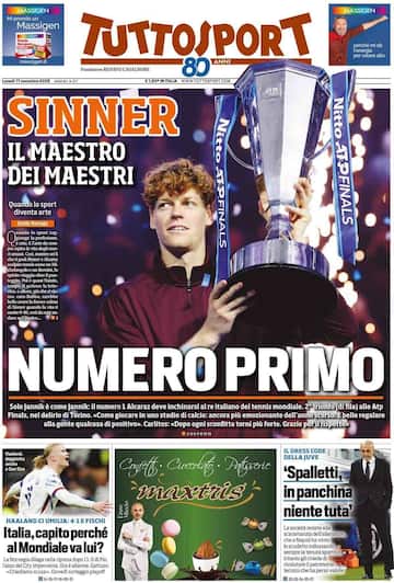 - In apertura “Sinner, il maestro dei maestri”, con l’immagine del tennista che alza il trofeo a Torino. “Numero primo”, Sinner è al suo secondo trionfo consecutivo alle Atp Finals. In taglio basso, calcio con “Italia, capito perché al Mondiale va lui?” sulla sconfitta con la Norvegia e i gol di Haaland. A destra, spazio alla Juventus con “Spalletti, in panchina niente tuta”.
