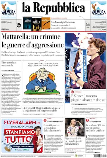 - L’apertura è sul discorso di Sergio Mattarella al Bundestag di Berlino: “Mattarella: un crimine le guerre d’aggressione”. Sotto, l’analisi sulla guerra in Ucraina con “Kiev non deve restare sola”. In spalla spazio al tennis con “È Sinner il maestro: piegato Alcaraz in due set”. In primo piano anche “Dietrofront FdI sui limiti allo sciopero”. In taglio basso: “Se tutti ignorano la resistenza della classe media” e “Figuraccia Italia: ne prende quattro dalla Norvegia”.