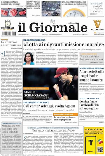 - L’apertura è dedicata alla politica britannica “Lotta ai migranti missione morale”, con la ministra “pakistana laburista che propone una stretta per ottenere i permessi”. In alto, la cronaca milanese con “Schianto mortale a Milano: una senza patente e l’altro è drogato”. Al centro pagina lo sport con “Sinner schiaccasassi”, dopo il successo alle Finals. In evidenza anche “Call center selvaggi, svolta Agcom”. In spalla: “Allarme del Colle: troppi leader amano l’atomica”.