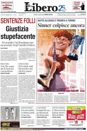 - L’apertura è su cronaca giudiziaria con “Giustizia stupefacente”, dove “per un giudice 4 kg di marijuana sono uso personale. Il rap? Giustifica l'utilizzo”. In primo piano anche lo sport con “Sinner colpisce ancora”, dopo la vittoria su Alcaraz a Torino. A centro pagina “Toh, Elly scopre che la sicurezza è un problema” e “Il Pd chiede soldi ma non dice mai chi deve pagare”. In taglio basso “Profughi di Gaza già dimenticati dai democratici”.