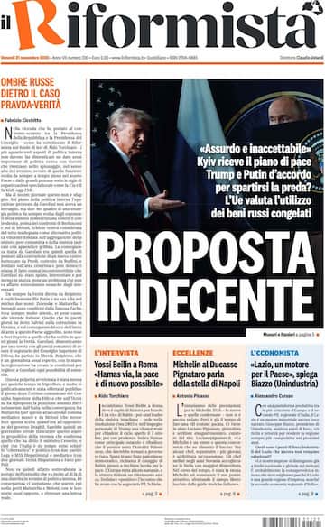 - L’apertura è sulla guerra in Ucraina: “Proposta indecente”, con riferimento al piano di pace percepito come inaccettabile da Kiev. “Trump e Putin d'accordo per spartirsi la preda? L'Ue valuta l'utilizzo dei beni russi congelati”. In spalla, “Ombre russe dietro il caso Pravda-Verità”. In taglio basso, l’intervista “Yossi Beilin a Roma: ‘Hamas via, la pace è di nuovo possibile’”. E “Lazio, un motore per il Paese”, spiega Biazzo (Unindustria).