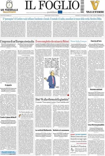- L’apertura-commento è “Il ‘porcospino’ di Canfora vuole infilzare l’Occidente e Israele. Il metodo è il solito, cancellare le tracce della verità. Sembra Dibba”. In primo piano la guerra in Ucraina con “L’urgenza di un’Europa a testa alta”, sul caos del piano di pace Usa e la scelta dell'Ucraina di continuare a negoziare con Trump. In evidenza anche “Il vero complotto che minaccia Meloni” e “Dini: ‘Sì alla riforma della giustizia’”.