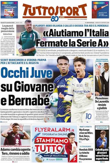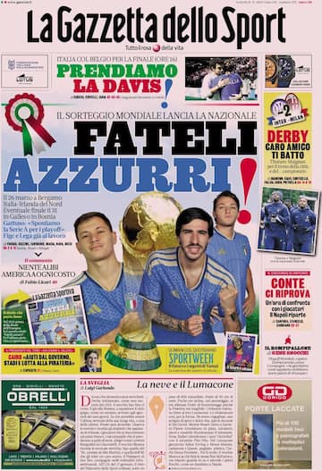 - L’apertura è sulla Nazionale con il titolo a tutta pagina “Fateli Azzurri!”, dopo il sorteggio che porta l’Italia ai playoff contro l’Irlanda del Nord: il 26 marzo a Bergamo Italia-Irlanda del Nord. Eventuale finale il 31 in Galles o in Bosnia. In evidenza anche la Coppa Davis con “Prendiamo la Davis!”, dedicata alla finale con il Belgio. A lato, il derby di Milano: “Derby caro amico ti batto: Thuram-Maignan per il trono della città e del...campionato”. Spazio al Napoli con “Conte ci riprova: un’ora di confronto con i giocatori”.