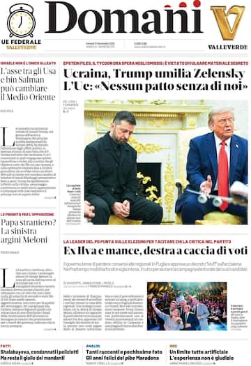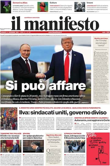 - In apertura la guerra in Ucraina e il piano di pace Usa “Si può affare”, con la foto di una stretta di mano tra Trump e Putin: “Consegnato a Kiev il ‘piano in 28 punti’, ma è il progetto russo con firma americana: affitta il Donbass a Mosca, disarma l'Ucraina, lascia il conto alla Ue”, con il commento “Per l’Ucraina una non-pace ‘storica’”. Spazio anche a “Ilva: sindacati uniti, governo diviso”. In taglio basso “Un ‘golpe giudiziario’ per colpire Sánchez”.
