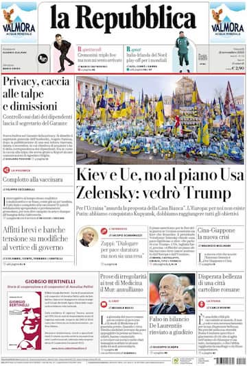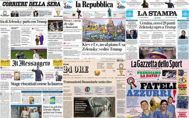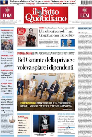 - In primo piano “Privacy, caccia alle talpe e dimissioni”, sul caso che coinvolge il segretario generale del Garante e l’accesso ai dati dei dipendenti. Il titolo principale di politica estera: “Kiev e Ue, no al piano Usa. Zelensky: vedrò Trump”, “Per l'Ucraina "assurda la proposta della Casa Bianca". In evidenza anche “Affitti brevi e banche: tensione su modifiche al vertice di governo”. In taglio basso “Falso in bilancio, De Laurentiis rinviato a giudizio”.