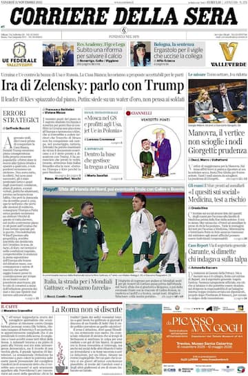 - In apertura l’“Ira di Zelensky: parlo con Trump”, con il leader ucraino “spiazzato dal piano. Putin: siede su un water d'oro, non pensa ai soldati”. In spalla, la politica interna con “Manovra, il vertice non scioglie i nodi Giorgetti: prudenza”. In primo piano anche lo sport con “Italia, la strada per i Mondiali. Gattuso: ‘Possiamo farcela’”, dedicato ai playoff contro l’Irlanda del Nord. In spalla, “I quesiti sui social: Medicina, test a rischio” e “Garante, si dimette chi indagava sulla talpa”.