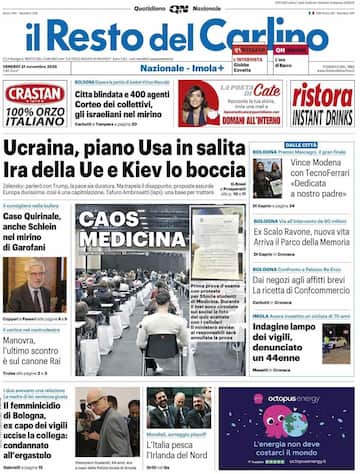 - Il titolo principale è “Ucraina, piano Usa in salita. Ira della Ue e Kiev lo boccia”, che racconta il rifiuto del piano di pace Usa. A centro pagina campeggia “Caos Medicina”. In spalla “Caso Quirinale, anche Schlein nel mirino di Garofani”. Tra i richiami della manovra c’è “Manovra, l’ultimo scontro è sul canone Rai”. In taglio basso spazio allo sport con “L’Italia pesca l’Irlanda del Nord”.