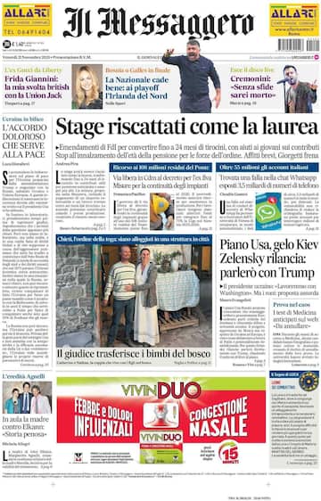 - In apertura “Stage riscattati come la laurea”, sugli emendamenti FdI che puntano alla conversione dei tirocini in contributi per la pensione. A centro pagina, la guerra in Ucraina con “Piano Usa, gelo Kiev. Zelensky rilancia: parlerò con Trump”. In taglio alto, lo sport con “La Nazionale cade bene: ai playoff l’Irlanda del Nord”. In primo piano anche: “Ricorso ai 108 milioni residui del Ponte: via libera in Cdm al decreto per l’ex Ilva”. In taglio basso “Il giudice trasferisce i bimbi del bosco”.