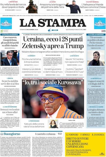 - L'apertura è su “Ucraina, ecco i 28 punti Zelensky apre a Trump”, che illustra il piano consegnato a Kiev e le reazioni internazionali. Tra i commenti, “Più che una trattativa è show business”. In spalla, la politica economica con “Caos manovra, Giorgetti frena gli assalti dei partiti su affitti e banche”. Spazio anche a Spike Lee, che arriva al Torino Film festival: "Io, trai social e Kurosawa”. In taglio basso, “Kate, più della corona vale la forza dell’amore”.