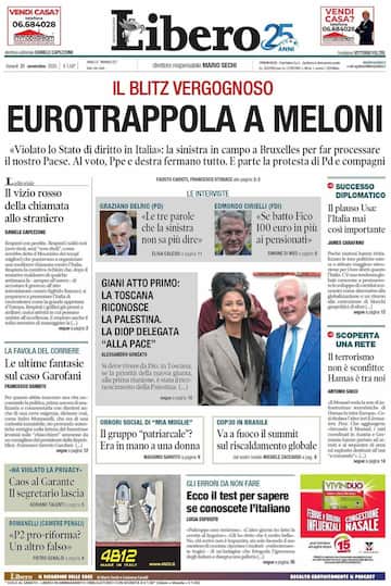 - In apertura “Eurotrappola a Meloni”: “‘Violato lo Stato di diritto in Italia’: la sinistra in campo a Bruxelles per far processare il nostro Paese. Al voto, Ppe e destra fermano tutto. E parte la protesta di Pd e compagni”. L’editoriale: “Il vizio rosso della chiamata allo straniero”. Tra le interviste “Le tre parole che la sinistra non sa più dire”, con le parole di Graziano Delrio (Pd). Al centro della pagina “Giani atto primo: la Toscana riconosce la Palestina”. In taglio basso: “Ecco il test per sapere se conoscete l’italiano”.