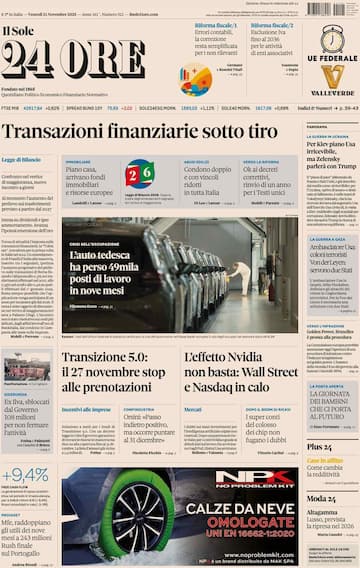 - In apertura la legge di bilancio con “Transazioni finanziarie sotto tiro”. In taglio alto, “Errori contabili, la correzione resta semplificata per i non rilevanti” e “Esclusione Iva fino al 2036 per le attività di enti associativi”. Al centro, “L’auto tedesca ha perso 49mila posti di lavoro in nove mesi”. Spazio anche a “Transizione 5.0: il 27 novembre stop alle prenotazioni”. In spalla: “Per Kiev piano Usa irricevibile, ma Zelensky parlerà con Trump”.