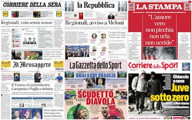 Ci sono i risultati delle Regionali in Veneto, Campania e Puglia su quasi tutte le aperture dei giornali in edicola. Confermate le previsioni con i successi di Stefani, Fico e Decaro, ma l'afffluenza non arriva al 50%. Meloni: "Confermata nostra serietà". E Schlein: "Ora c'è alternativa". Spazio anche al piano in 19 punti per l'Ucraina, con Trump ottimista, e all'ultimo saluto per Ornella Vanoni, con i funerali celebrati a Milano. Sugli sportivi vigilia di Champions, con una serata decisiva per Juventus e Napoli