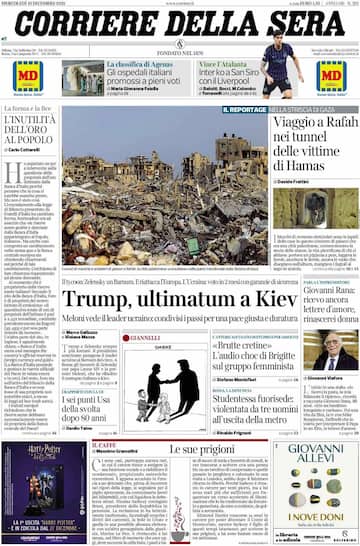 - In primo piano la guerra in Ucraina “Trump, ultimatum a Kiev”, dove si racconta della pressione del presidente Usa su Zelensky: “Il tycoon: Zelensky un Barnum. E riattacca l'Europa”. Spazio all’analisi “L’inutilità dell’oro al popolo”. In spalla il reportage dalla Striscia di Gaza “Viaggio a Rafah nei tunnel delle vittime di Hamas”. In primo piano anche all’intervista a Giovanni Rana: “Ricevo ancora lettere d’amore, rinascerei donna”. In taglio basso: “Studentessa fuorisede: violentata da tre uomini all’uscita della metro”.
