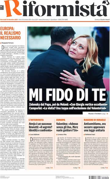 - In apertura la guerra in Ucraina, con l’analisi “Europa: il realismo necessario” e fotonotizia dedicata all’incontro a Roma tra Zelensky e Meloni “Mi fido di te”, “Zelensky dal Papa, poi da Meloni: ‘Con Giorgia vertice eccellente. Camporini: ‘La visita? Una toppa sull'esclusione dai Volenterosi’”. In taglio basso l’intervista “Atreju è un successo Brunetti: ‘Il segreto? Identità a confronto’”.