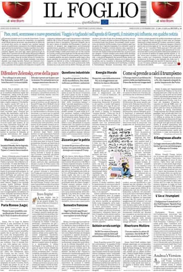 - L’editoriale “Pace, conti, scommesse e nuove generazioni. Viaggio (e tagliando) nell’agenda di Giorgetti, il ministro più influente, con qualche notizia”. In primo piano la guerra in Ucraina: “Difendere Zelensky, eroe della pace” con un focus sugli incontri Zelensky-Papa, Zelensky-Meloni. Tra gli altri richiami: “Come si prende a calci il trumpismo”, e “Il Congresso alleato. La legge americana sulla Difesa limita il governo sul disimpegno in Europa e in Ucraina”.