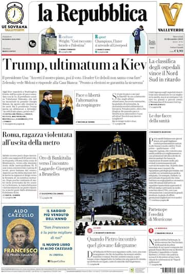 - La prima pagina apre con “Trump, ultimatum a Kiev”, “Il presidente Usa: ‘Accetti il nostro piano, poi il voto. I leader Ue deboli non sanno cosa fare’. Zelensky vede Meloni e risponde alla Casa Bianca: ‘Pronto a elezioni se garantita la sicurezza’”. In evidenza anche il tema della sanità con “La classifica degli ospedali vince il Nord Sud in ritardo”. Nel taglio centrale: “Ragazza violentata all’uscita della metro” e “Oro di Bankitalia verso l’incontro Lagarde-Giorgetti a Bruxelles”.