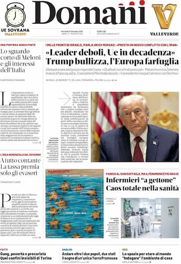 - In apertura la guerra in Ucraina “‘Leader deboli, Ue in decadenza’. Trump bullizza, l’Europa farfuglia”. In spalla, un’analisi sulle scelte del governo: “Lo sguardo corto di Meloni e gli interessi dell’Italia”. In primo piano, la proposta fiscale: “A tutto contante. La tassa premia solo gli evasori”. Nel taglio basso compare il tema sanitario: “Infermieri ‘a gettone’. Caos totale nella sanità”.