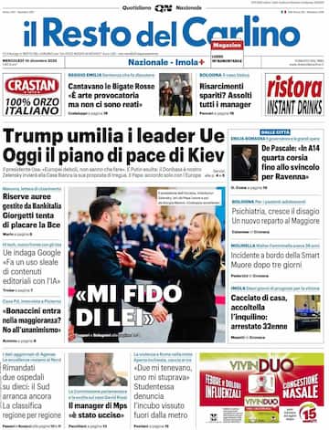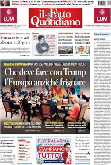 - L’apertura è sulla guerra in Ucraina: “Trump umilia i leader Ue. Oggi il piano di pace di Kiev”. Sotto, il titolo sull’incontro a Roma: “Mi fido di lei” con la foto di Zelensky e Meloni. In primo piano:“Cantavano le Bigate Rosse: ‘È arte provocatoria ma non ci sono reati’”. In taglio basso: “Rimandati due ospedali del Sud: l’Ssn arranca ancora. La classifica regione per regione”. In spalla: “Cacciato di casa, accoltella l’inquilino: arrestato 32enne”.