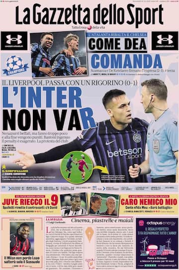 - La Gazzetta apre con "Il Liverpool passa con un rigorino, l'Inter non Var", riferito alla sconfitta nerazzurra contro il Liverpool: “Nerazzurri beffati, ma fanno troppo poco e alla fine vengono puniti. Bastoni ingenuo il penalty è esagerato. La protesta del club”. In alto l’Atalanta con “Come Dea comanda”, dopo la rimonta sul Chelsea. In taglio basso spazio alla Juventus “Juve riecco il 9” e al Milan “Il Milan non perde Leao: salterà solo il Sassuolo”.