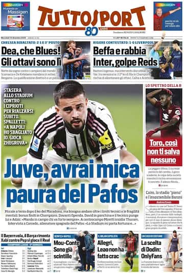 - Il titolo principale è dedicato alla Juventus: “Juve, avrai mica paura del Pafos”, con il focus sulla necessità di rialzarsi dopo il ko con il Napoli. Sulla destra l’allarme per la crisi del Torino con “Toro, così non ti salva nessuno”.