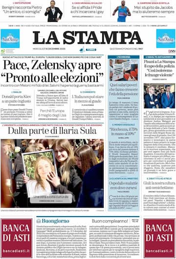 - In apertura la guerra in Ucraina “Pace, Zelensky apre ‘Pronto alle elezioni’”, “Incontro con Meloni: mi fido di lei”, con l’analisi “Donald porta Kiev a un patto ingiusto” e l’approfondimento europeo “Perché l’Europa è meglio degli Usa”. In spalla: “Pisani a La Stampa. Il capo della polizia: ‘Così isoleremo le frange violente’”. Spazio anche a “Dalla parte di Ilaria Sula, L’Università la Sapienza ammessa come parte civile al processo”.