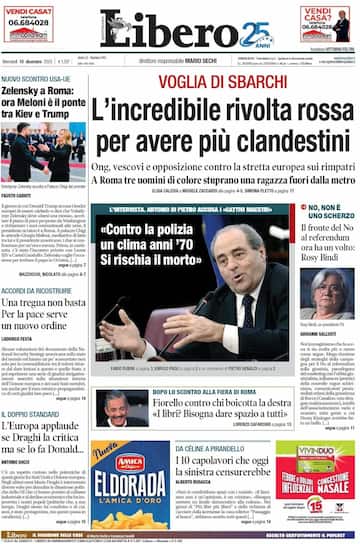 - In primo piano “L’incredibile rivolta rossa per avere più clandestini”. In spalla, la guerra in Ucraina “Zelensky a Roma: ora Meloni è il ponte tra Kiev e Trump”. In primo piano anche l’intervista “Antonio di Pietro accusa: “Cattivi Maestri”,”Contro la polizia un clima anni ’70. Si rischia il morto”. In spalla: “Il fronte del No al referendum ora ha un volto: Rosy Bindi”. In taglio basso spazio al tema culturale con “I 10 capolavori che oggi la sinistra censurerebbe”.