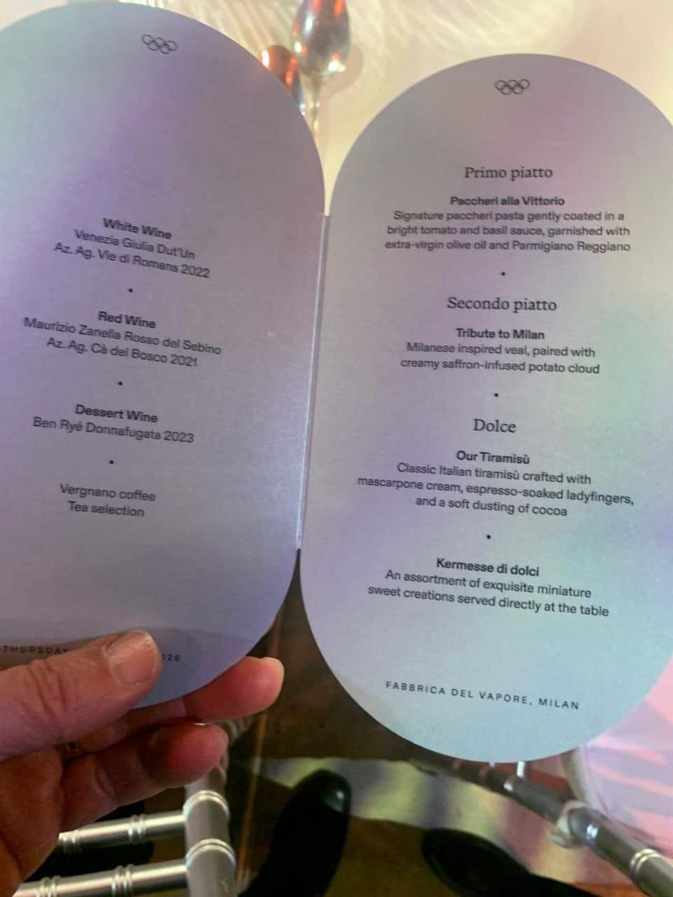 Il menù della serata, preparato dagli chef Enrico e Roberto Cerea, del tristellato Da Vittorio di Brusaporto, in provincia di Bergamo, ha previsto, tra le varie portate, i "Paccheri alla Vittorio", specialità della casa, e una cotoletta di vitello con crema di patate allo zafferano. Un iconico tributo alla città di Milano proprio verso i Giochi Olimpici. A chiudere il tutto, un grande classico della tradizione italiana, il tiramisù.