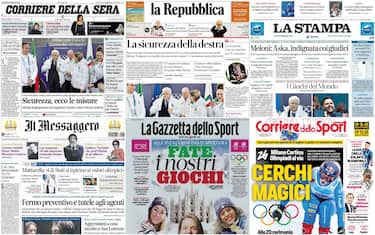 È il nuovo decreto Sicurezza varato dal governo a dominare le aperture dei giornali in edicola stamattina. Dal fermo preventivo di 12 ore alle tutele agli agenti, passando per la stretta sui coltelli, spazio alle misure del provvedimento. Meloni contro i giudici per le scarcerazioni dopo gli scontri di Torino. Grande spazio per il via ai Giochi olimpici invernali di Milano-Cortina, con la cerimonia inaugurale prevista per stasera. Il messaggio di Mattarella: "Che lo sport esprima desiderio di pace"