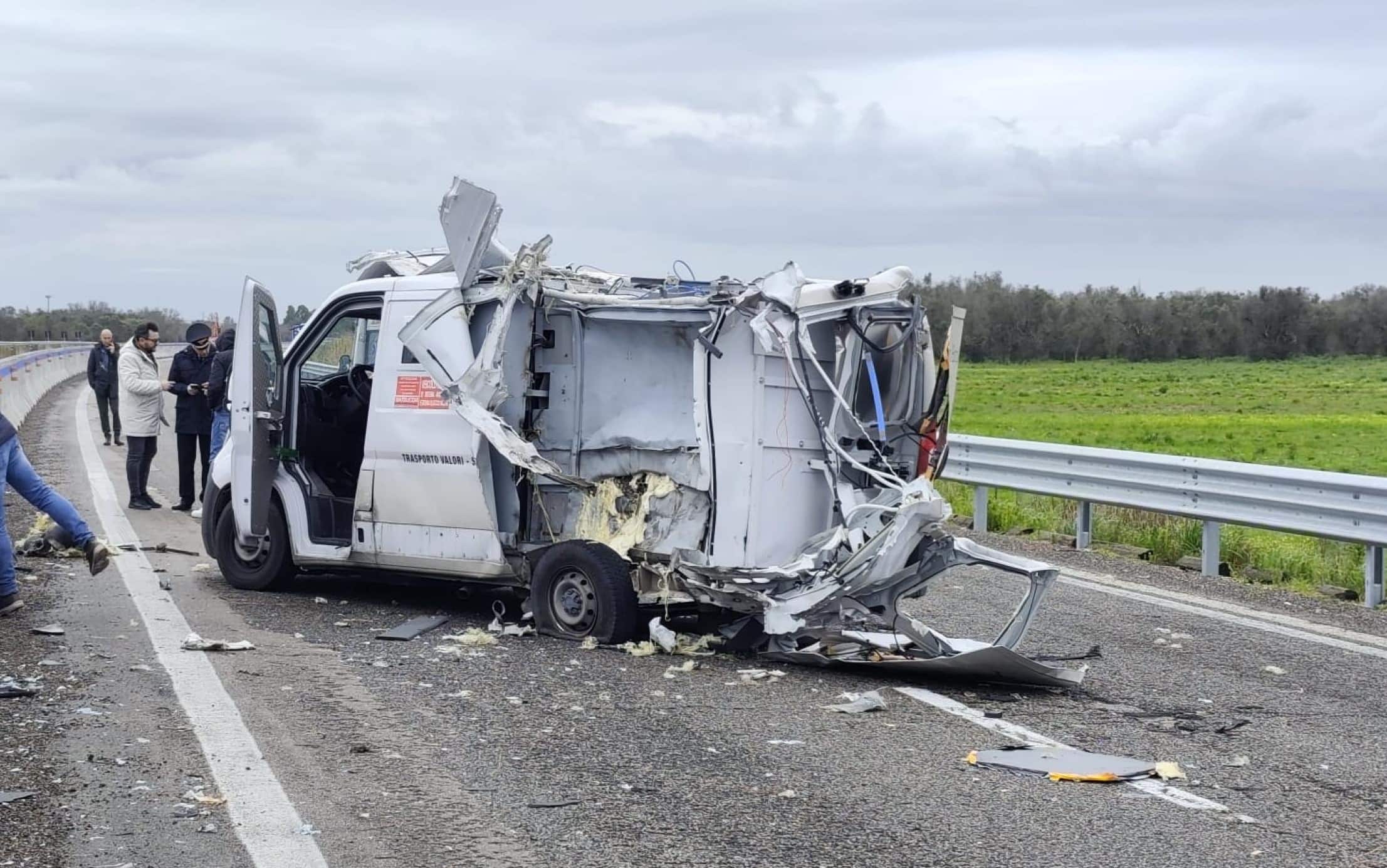 Il blitz è scattato con l'incendio di un mezzo pesante, utilizzato per bloccare entrambe le carreggiate e isolare la zona. Le fiamme hanno avvolto il camion, sprigionando una densa colonna di fumo nero visibile a chilometri di distanza. Nel conflitto a fuoco durante l'inseguimento tra banditi e militari dell'Arma, un colpo esploso dai primi, ha raggiunto un'auto dei carabinieri di una stazione del Brindisino raggiungendo l'abitacolo, non ci sono feriti. L'auto di un altro militare in borghese invece è stata mandata fuoristrada. I banditi hanno utilizzato esplosivo per scardinare il mezzo blindato che ha causato una nuvola di fumo. Poi sono scappati nel territorio di Squinzano in provincia di Lecce. I Indossavano tute bianche e nere ed erano armati di fucili. La maggior parte indossava il passamontagna. La statale è stata chiusa, in entrambe le direzioni dal km 8,300 al km 12,800 a San Pietro Vernotico (Brindisi). Sul posto sono presenti le squadre Anas e le forze dell'ordine per la gestione della viabilità - ha sapere Anas - e per il ripristino della normale circolazione nel più breve tempo possibile.