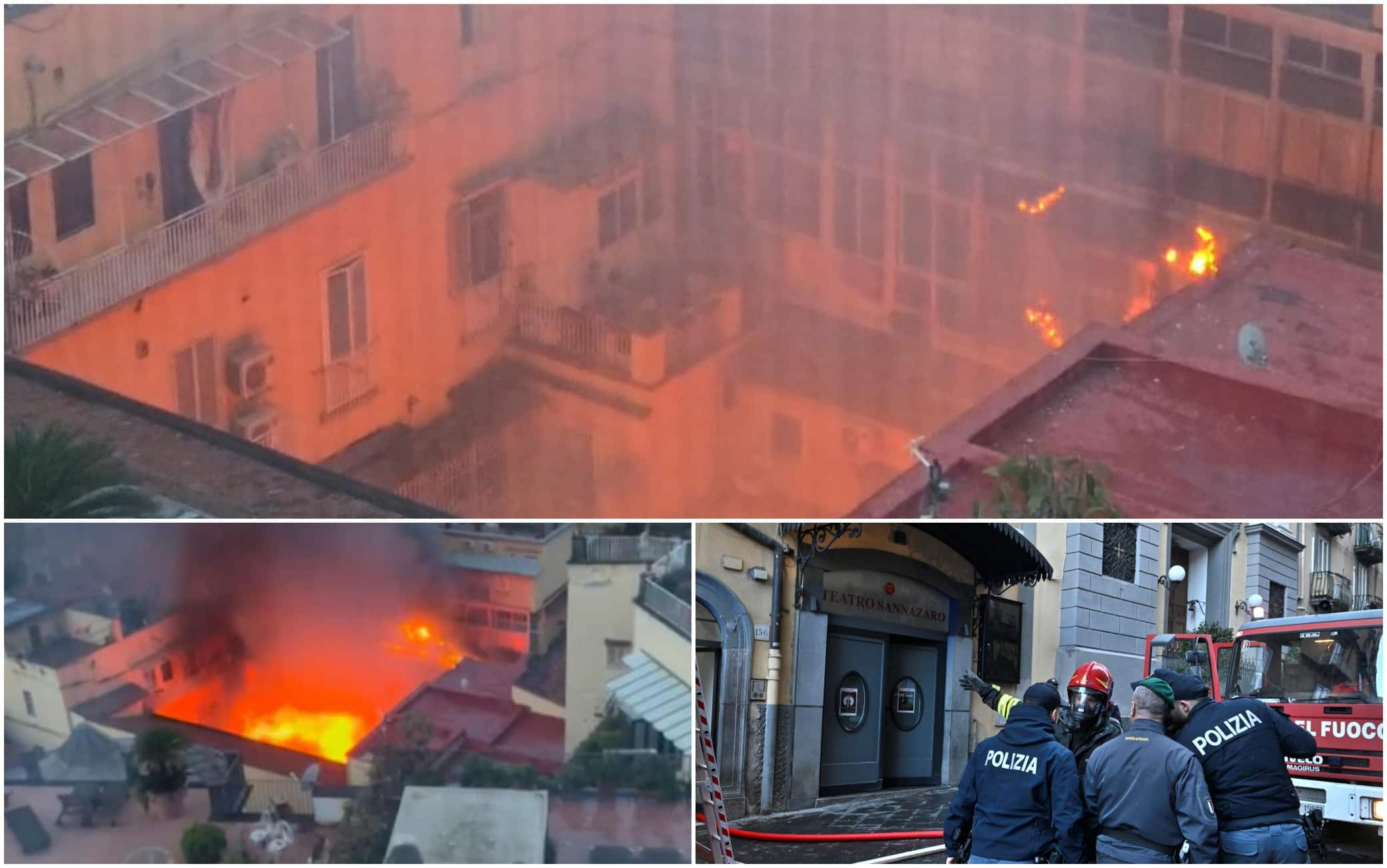 L'incendio, scoppiato questa notte, è ancora in atto. Sembra sia partito da un condominio nei pressi del teatro Sannazaro e si sia poi allargato alla struttura stessa. Sul posto stanno operando le squadre dei soccorritori con autobotti e diversi mezzi dei caschi rossi. Si opera per domare le fiamme, e non risultano feriti. Ancora non è ancora chiaro cosa abbia innescato l'incendio, ma le fiamme sono salite fino alla cupola. Le fiamme, intanto, continuano a divampare alte e, complice il vento, stanno lambendo la vicina chiesa di Sant'Orsola. La stessa Via Chiaia, zona pedonalizzata, è stata chiusa per un tratto a partire dal ponte di Chiaia. Continuano intanto ad arrivare mezzi dei vigili del fuoco, mentre le forze dell'ordine presidiano diversi punti per evitare il passaggio dei pedoni.